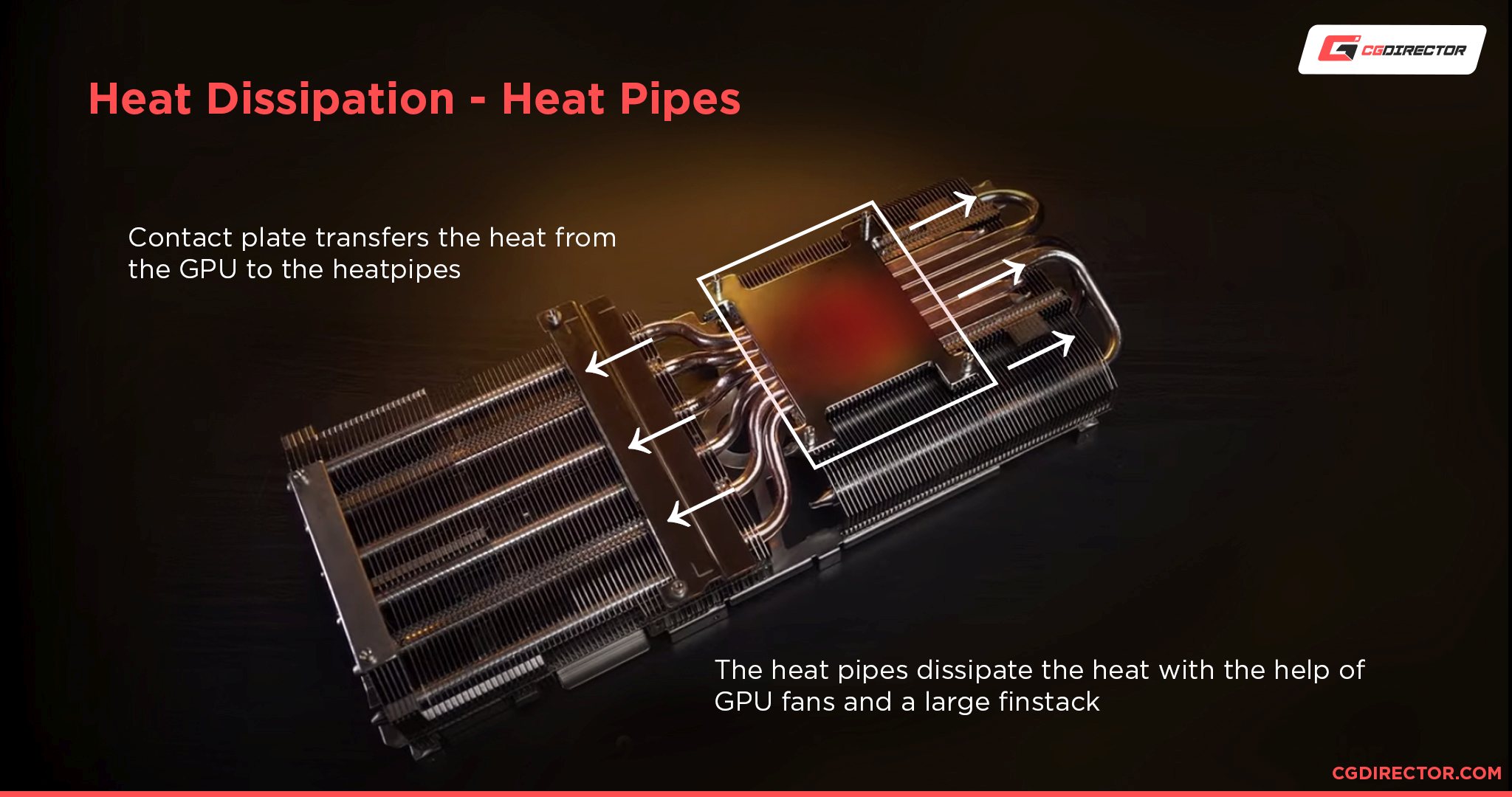 These heatpipes may be in direct contact with the GPU die (with some thermal paste in between) or employ a cold plate to distribute the heat evenly among the heatpipes.
