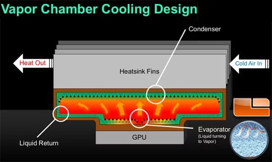 A vapor chamber uses evaporation and condensation of a liquid in a sealed chamber to transfer heat away from the heat source, the GPU die, and VRAM modules in this case. Heatpipes also work similarly but are cylindrical and are required in numbers to provide adequate heat transfer.