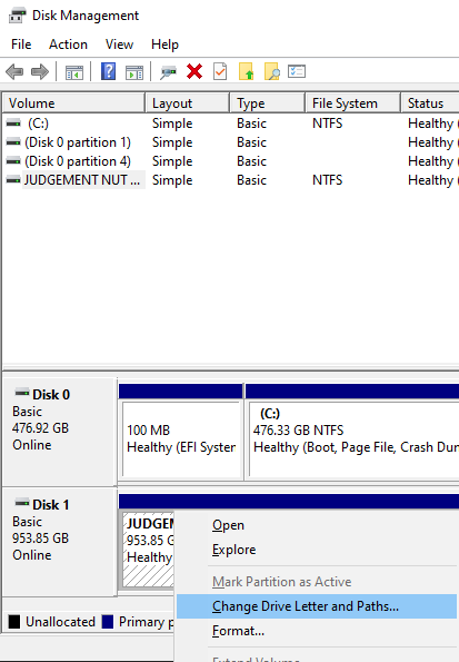 Now, inside Disk Management, right-click your drive of choice and select “Change Drive Letter and Paths”.
