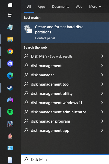 First, open Start. Then type “Disk Management”, and click “Create and format hard disk partitions”.